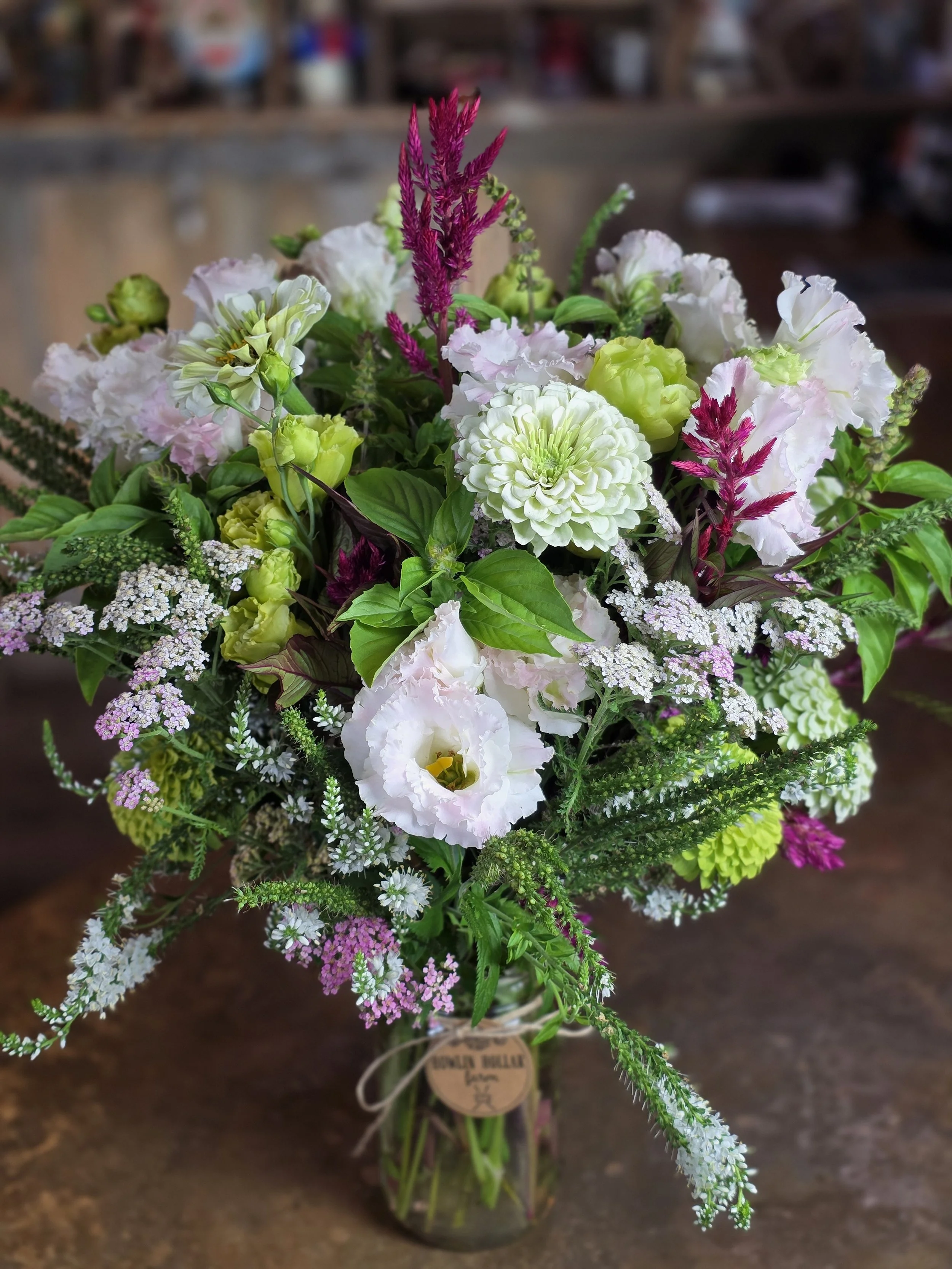 2026 Flower CSA! Enjoy farm fresh flowers all summer long. All flowers are grown right here on the Howlin Hollar Farm, harvested, conditioned and arranged for you. Enjoy farm fresh flowers all summer long. All flowers are grown right here on the Howlin Hollar Farm, harvested, conditioned and arranged for you. Typical mix of sunflowers, zinnias, cinnamon basil, cosmos, stock, lemon basil, rudbeckia, and so much more!! You can expect a variety of colors, aromas and a different bouquet every week.
